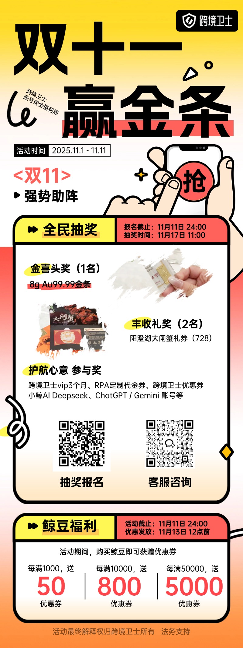 宝子们,双十一大战已经开启!当别人忙着抢折扣、囤货时,跨境人首先要做的,是守住自己的“账号根据地”。订单再旺,一旦账号出问题,所有努力都可能归零。