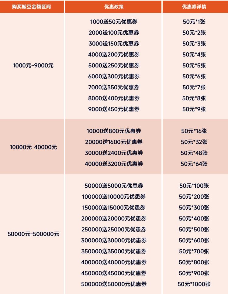 温馨提示:1、活动期间金额将持续累计;2、活动结束后,11月13日12点前统一发送优惠劵至账户;3、优惠券有效期为12个月,从领取成功当天起算;4、本次买鲸豆送优惠券活动,不与大客赠送鲸豆同时享用。